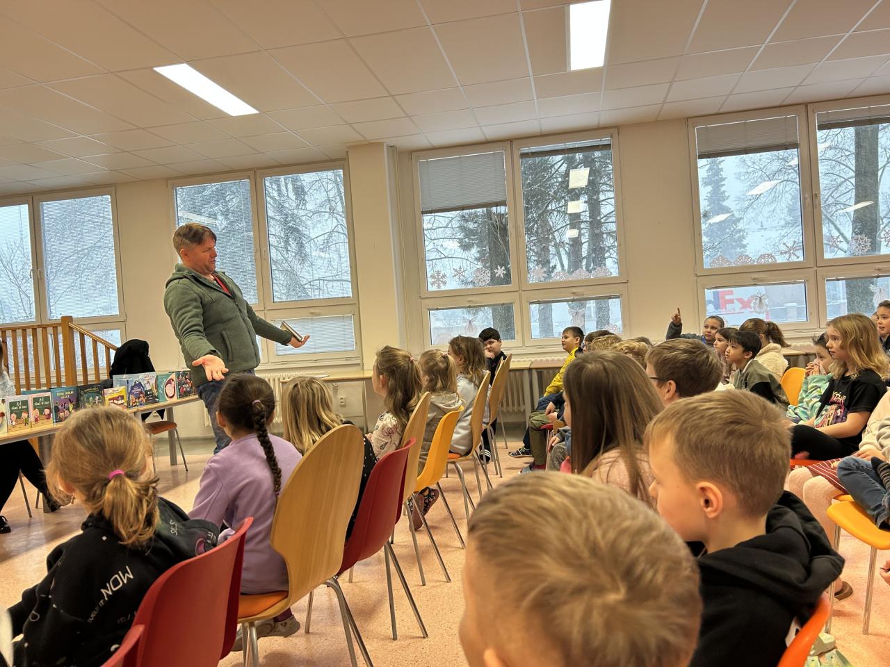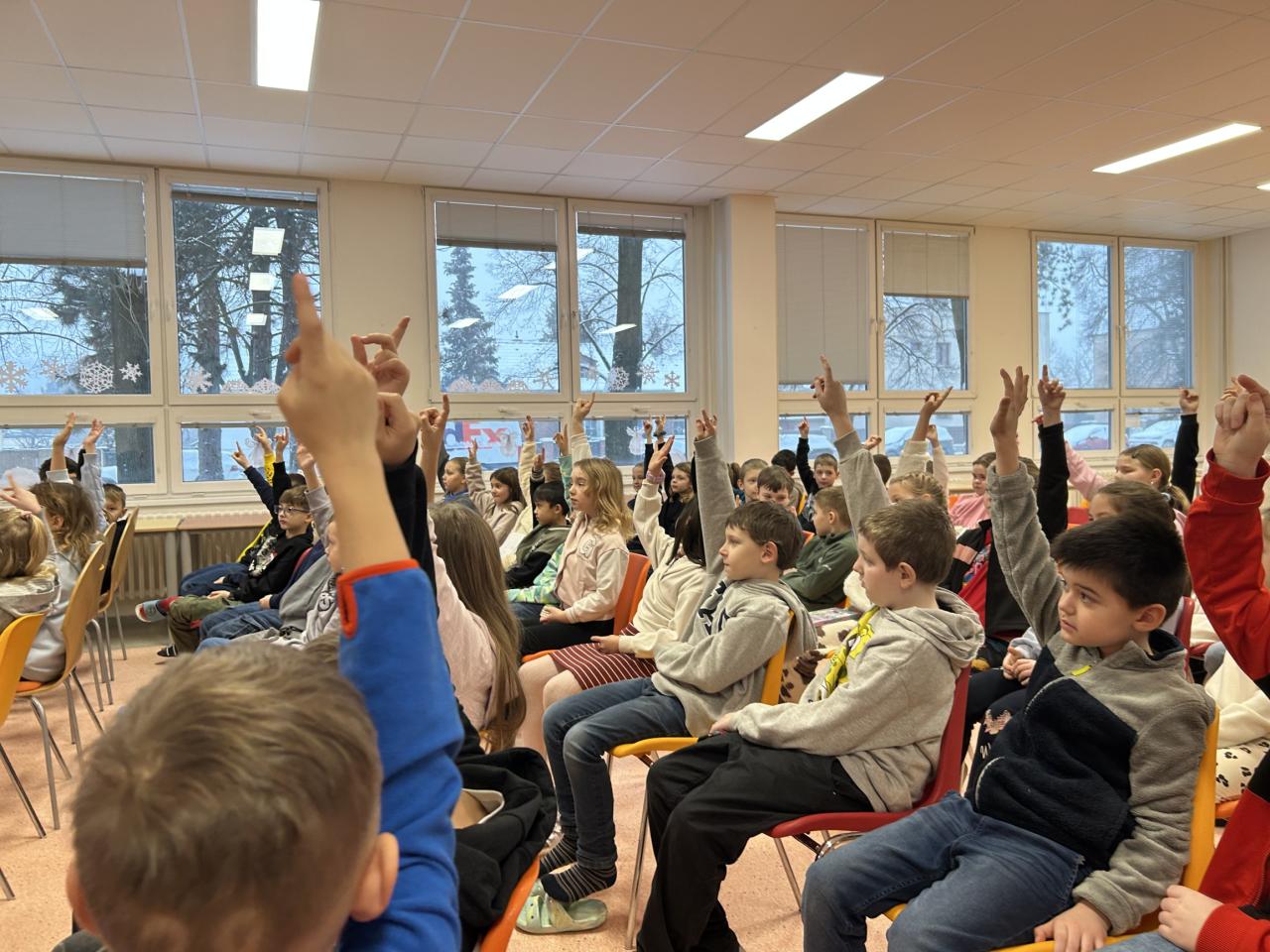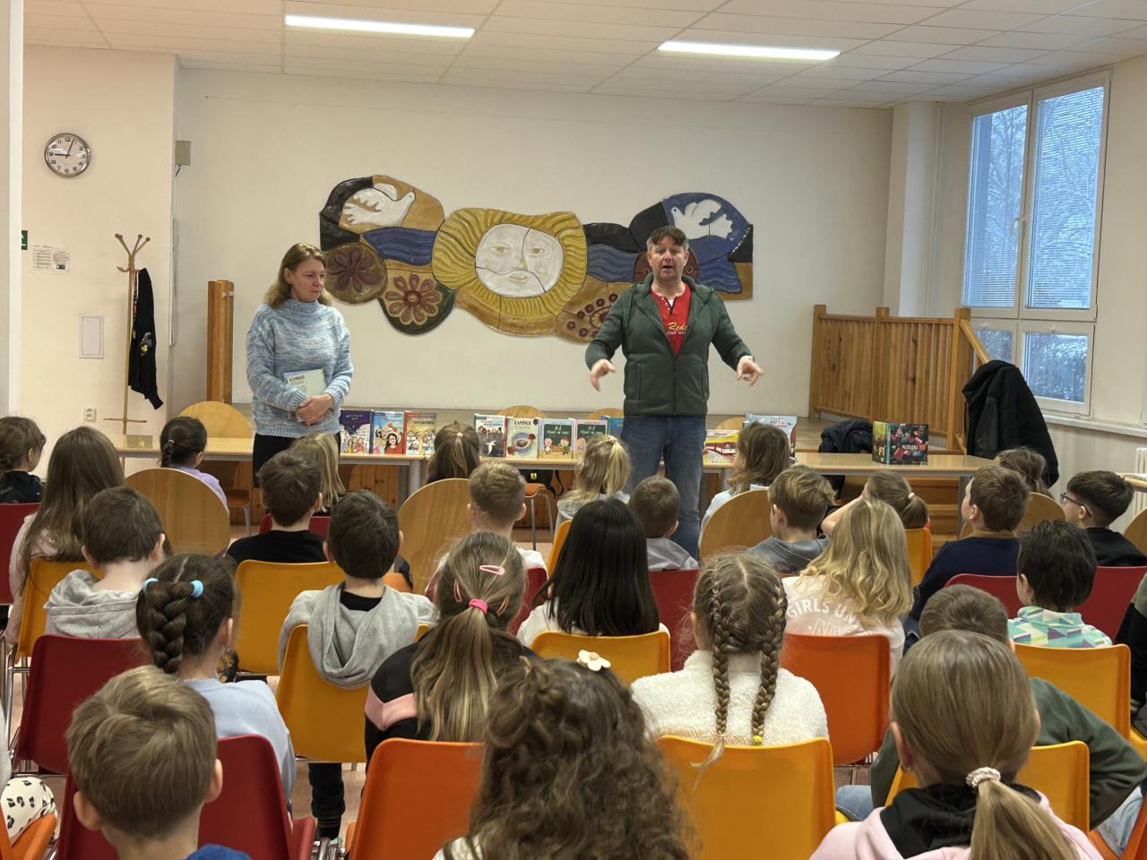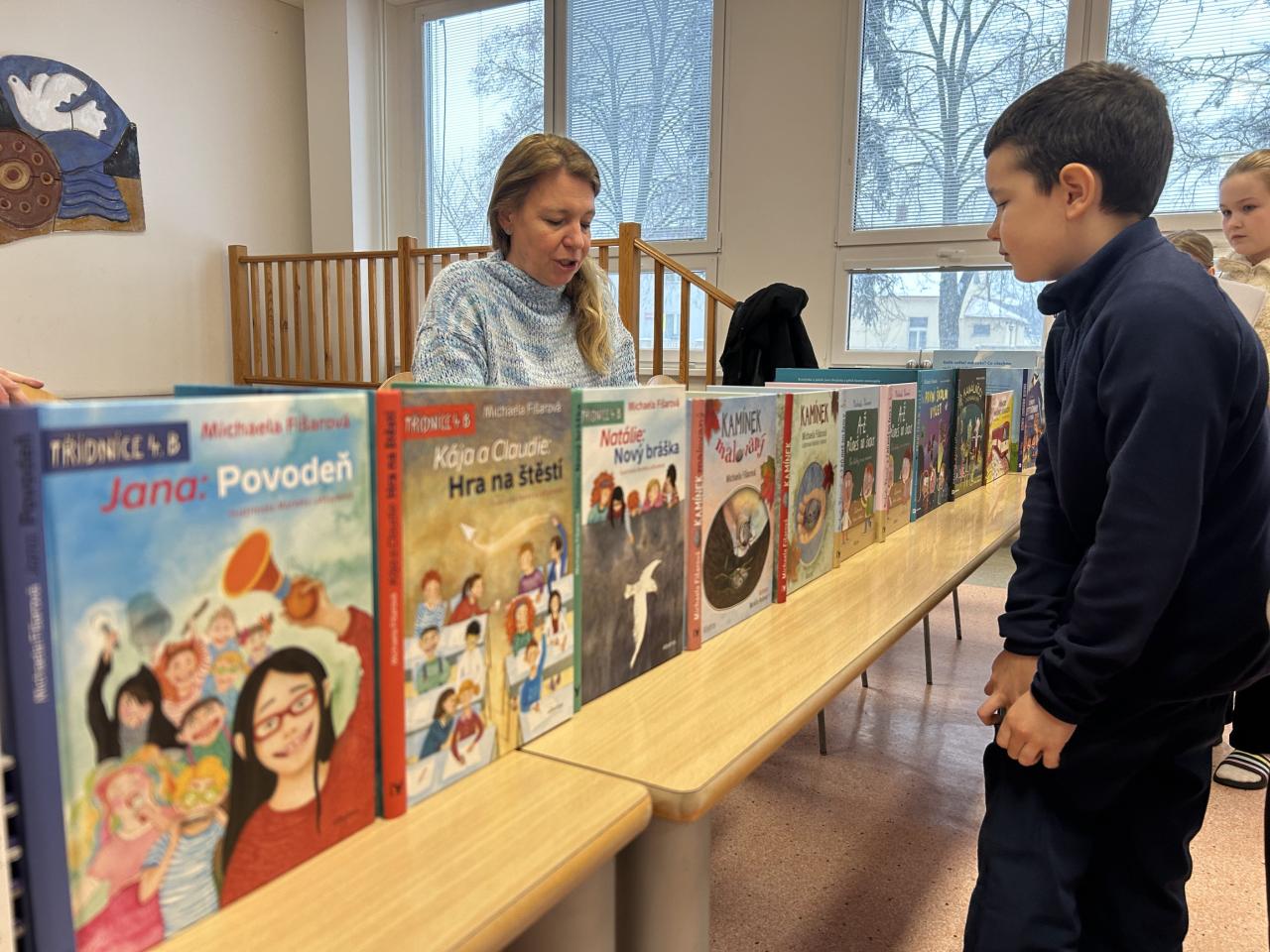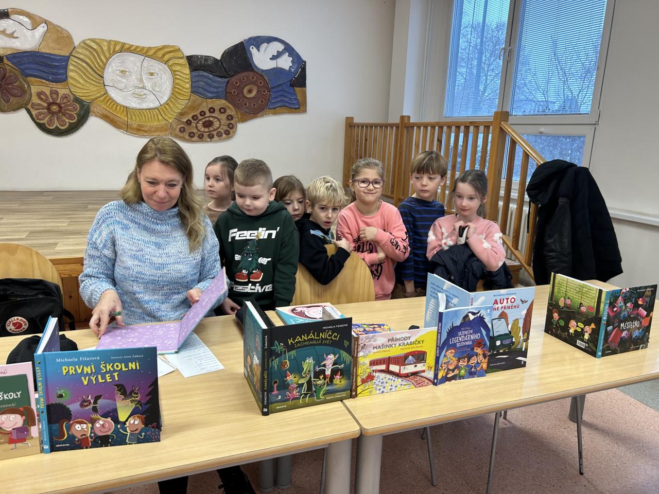 Dnes se ve škole uskutečnila beseda se spisovatelkou Michaelou Fišarovou, která směřovala k žákům prvního stupně. Spisovatelka představila dětem několik svých knih, jejichž obsah jim poutavým způsobem přiblížil herec Miroslav Reil. Děti byly aktivními účastníky besedy a ze setkání se spisovatelkou a hercem projevovaly nadšení. Dle jejich slov se jim nejvíce líbila zápletka příběhu o kamínku a také vtipná forma představení knihy.