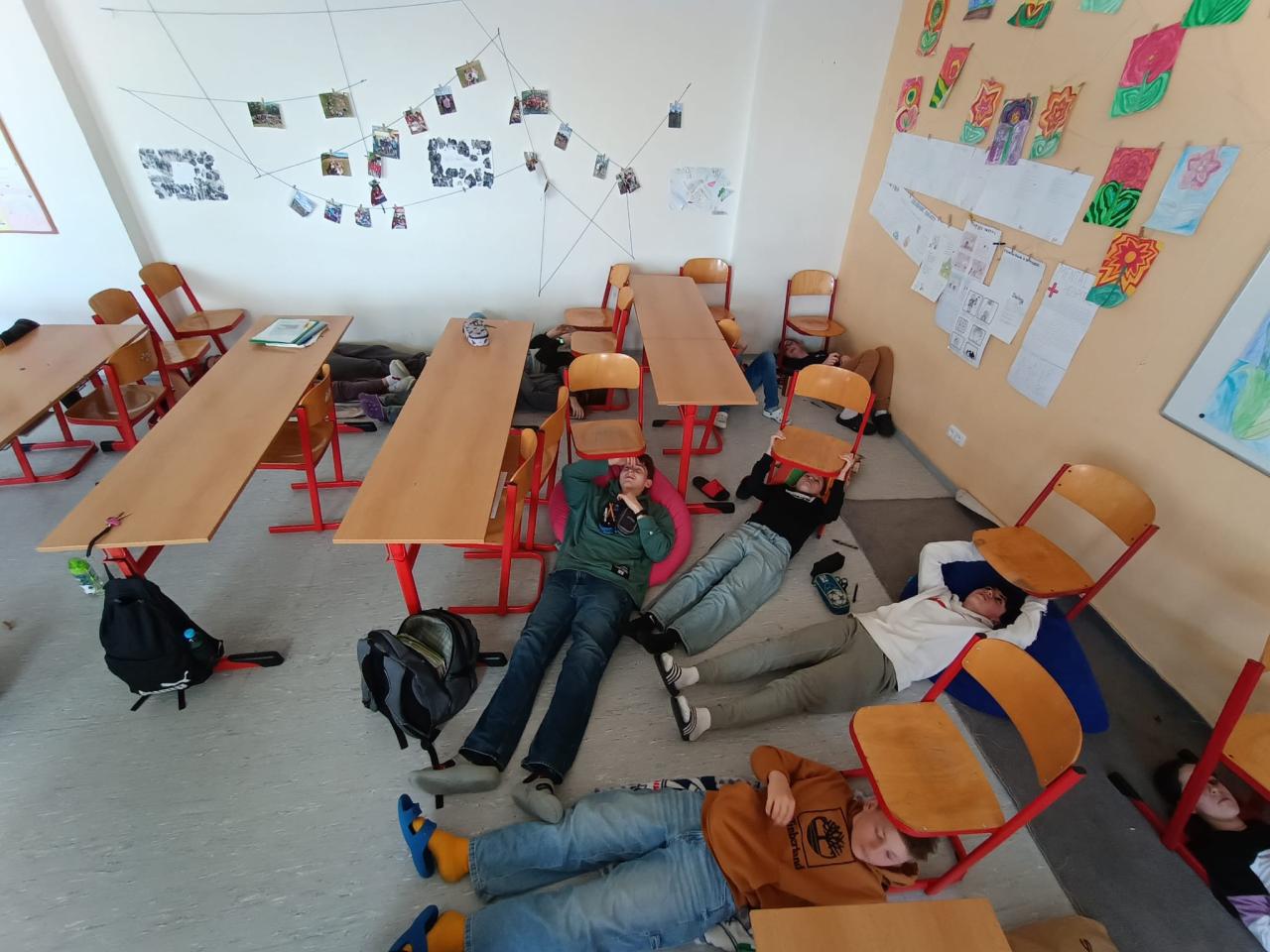 Ve středu dopoledne si třída 7.D vyzkoušela zcela netradiční výtvarnou činnost – malování v roli umělců s těžkým tělesným postižením. Žáci se na chvíli ocitli v kůži lidí, kteří v důsledku ochrnutí ovládají pouze hlavu a ruce. Tvořili vleže na zemi, s hlavou opřenou o polštář a papírem připevněným na spodní stranu školní židle – tak, jak by musel tvořit člověk s kvadruplegií nebo vážným pohybovým omezením.